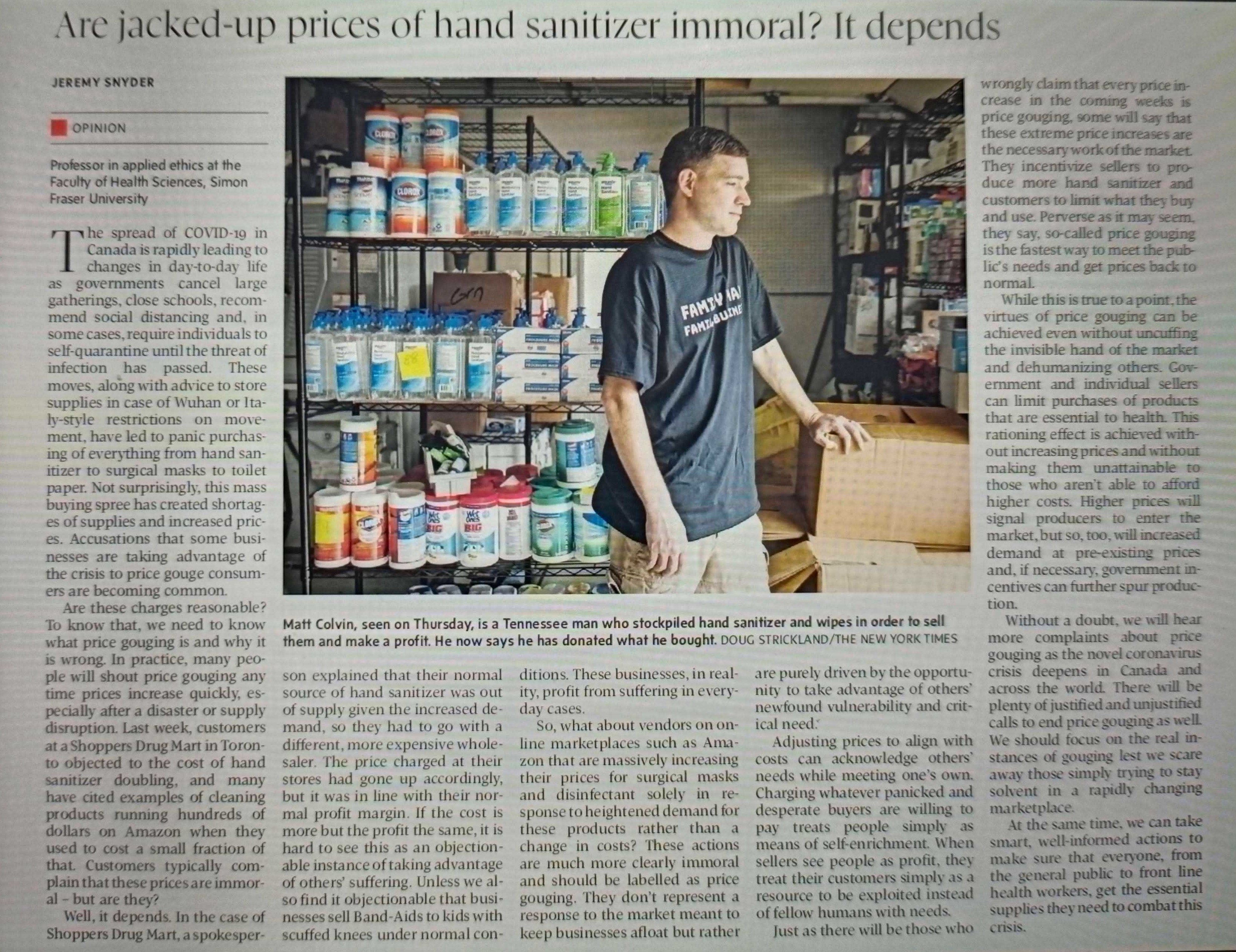 Since we are effectively in quarantine, we have lots of time to read and think --- activities that can be both good and not so good. The above article, from today's edition of the Globe and Mail, explores the differences between making a fair profit and price gouging. I recommend it to you for your consideration.